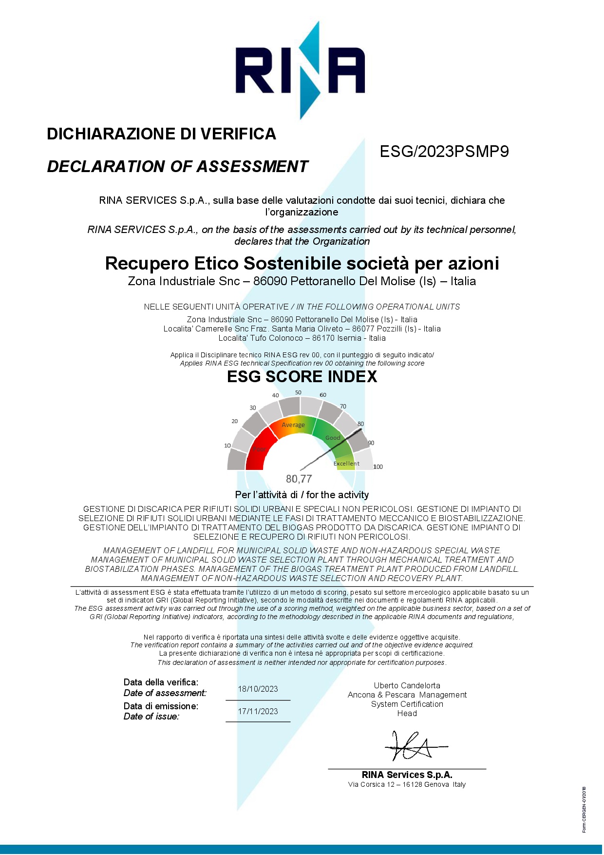 Certificazione di registrazione ESG – DECLARATION OF ASSESSMENT