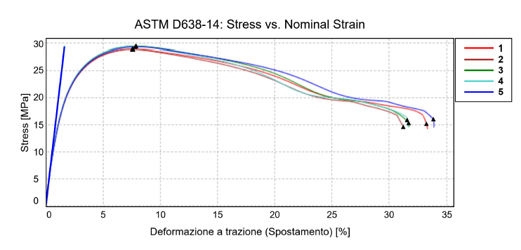 Questa prova distruttiva consente di valutare le principali proprietà meccaniche presenti nelle schede tecniche su provini standard e di registrare la curva sforzo-deformazione nel corso dell’analisi. È possibile ricavare informazioni sulla matrice polimerica e compararla a matrici caricate/additivate.